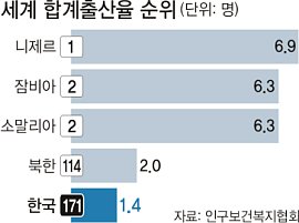 인구보건복지협의회가 25일 펴낸 유엔인구기금(UNFPA) '2011 세계인구현황보고서 한국어판'에 따르면 한국의 합계출산율은 선진국 평균인 1.7명에도 못미치는 1.4명으로 보스니아헤르체고비나(1.1명), 오스트리아·포르투갈(1.3명)에 이어 가장 낮았다. 세계 평균은 2.5명이었다.